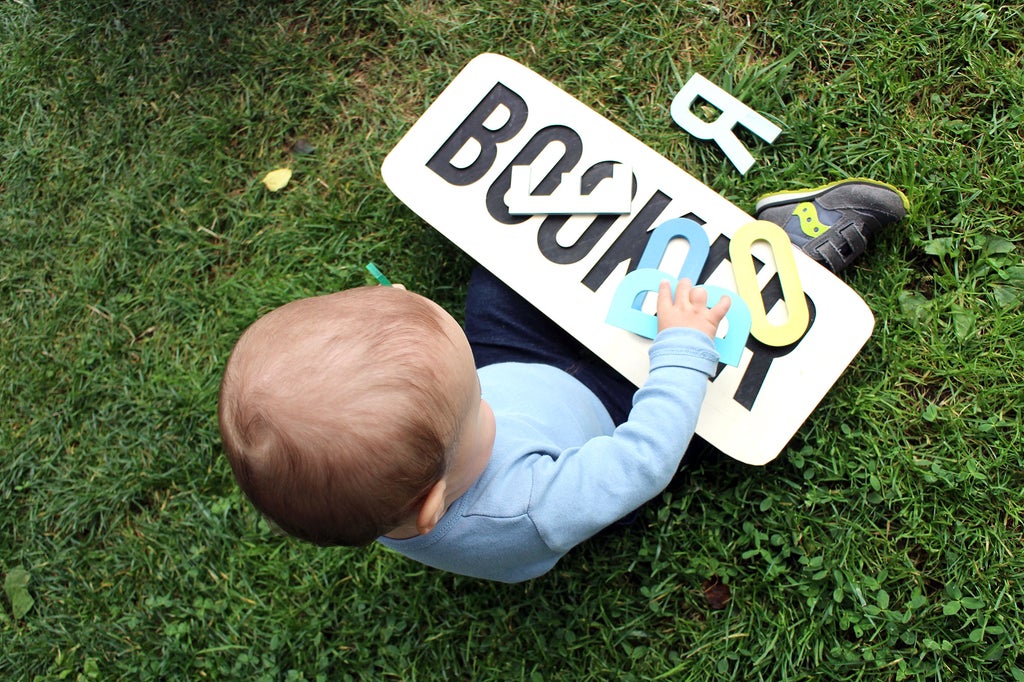 I painted the letter spaces black to stand out against the wood backing and really give depth to where the letters should be placed.